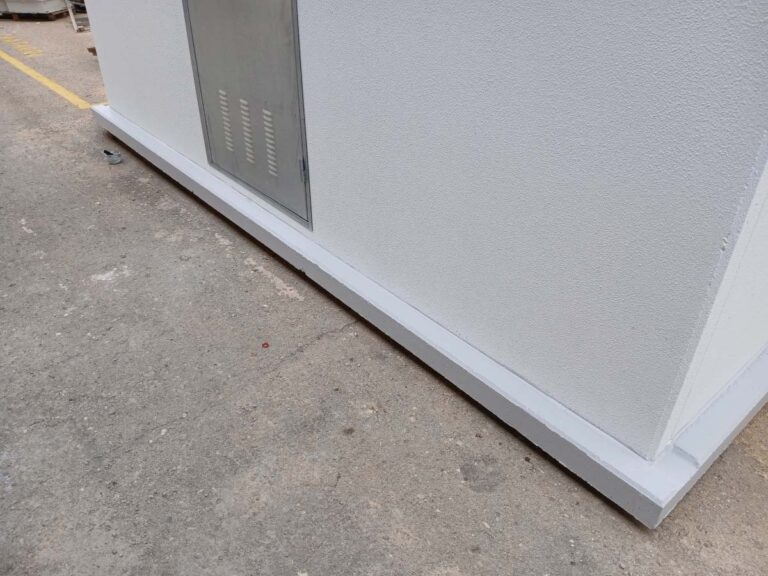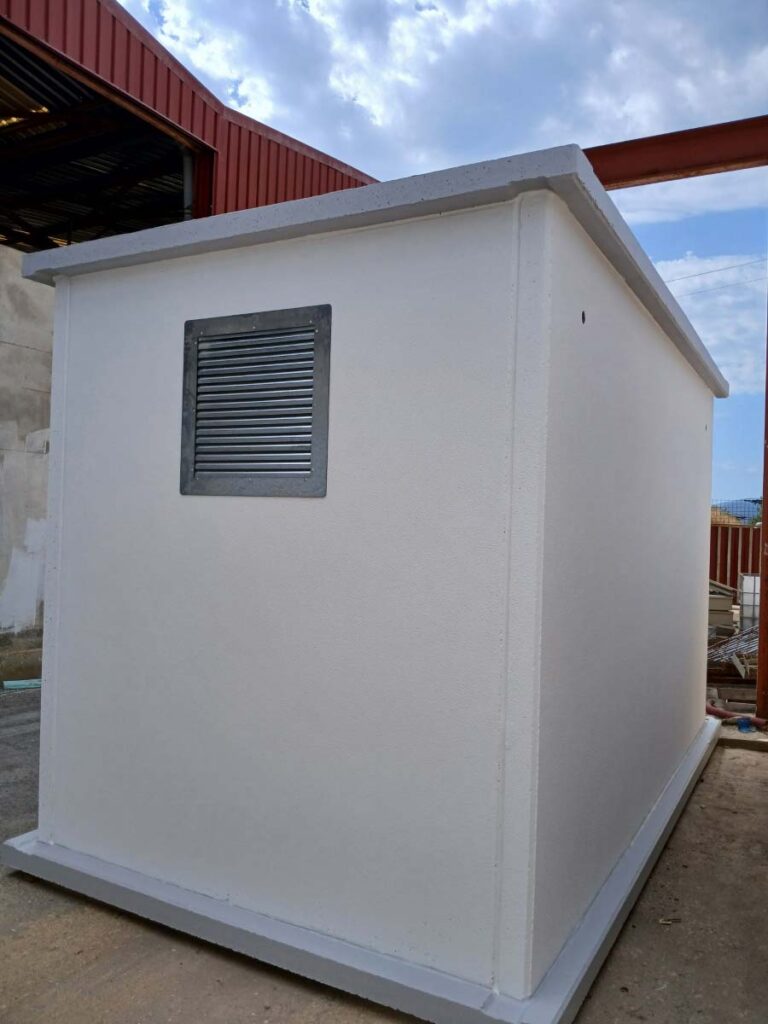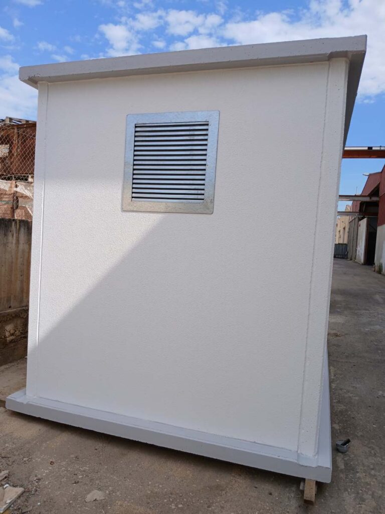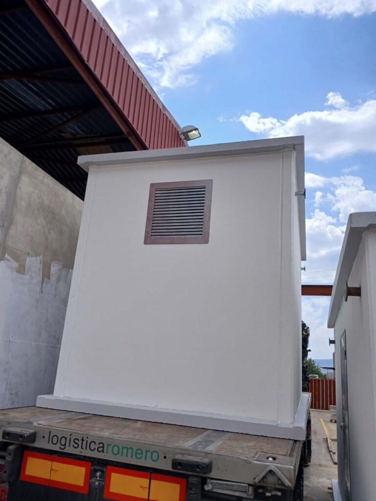 Suministro y montaje de una caseta prefabricada de hormigón modelo L4 en entorno técnico de un centro comercial en Alfafar, destinada a alojar equipos de servicio y control requeridos por el cliente; la unidad se entregó montada y preparada para la conexión y ventilación requerida por la instalación.