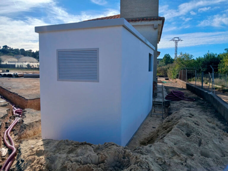 Edificio técnico prefabricado fabricado e instalado dentro de las instalaciones de la Comunidad de Regantes Els Xils. El edificio alberga el cuadro concentrador de inversores, el transformador de conversión solar a bomba, el cuadro de seguridad y vigilancia y el sistema de automatización general. Su diseño garantiza ventilación, accesibilidad y protección frente a agentes externos, asegurando un funcionamiento fiable de todos los equipos.