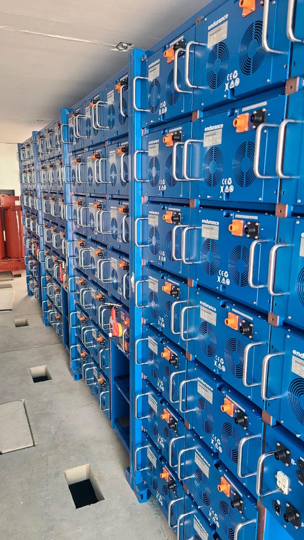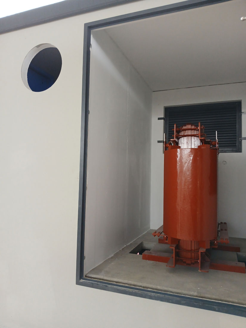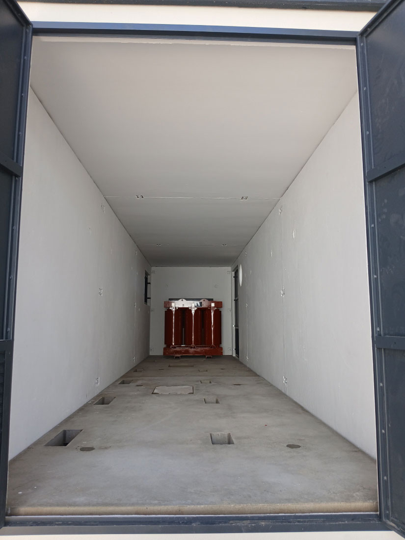 - Espacio interior destinado a transformador y sistema de baterías para almacenamiento fotovoltaico.