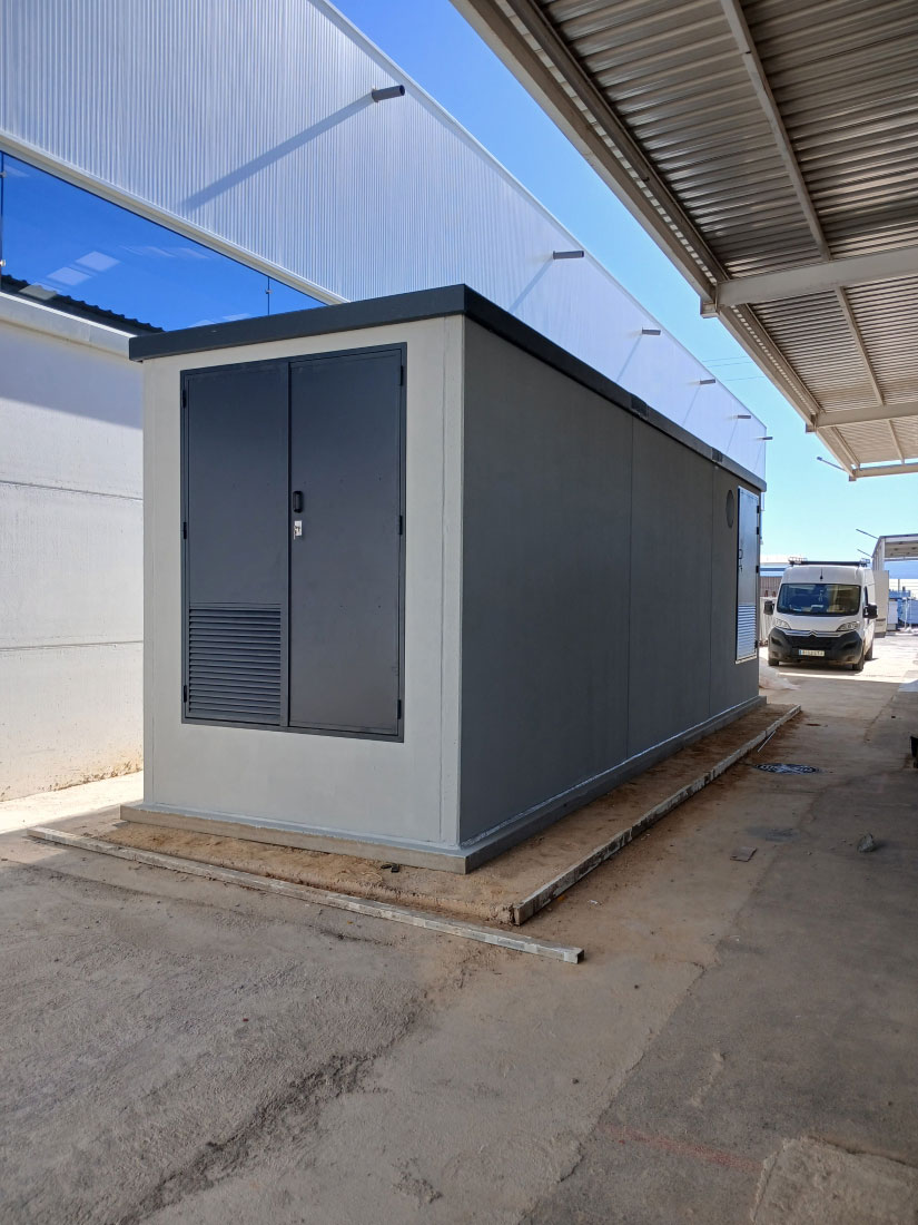 Fabricación y montaje de edificio prefabricado de hormigón destinado a albergar un centro de transformación y sistema de almacenamiento energético – baterías – asociado a instalación fotovoltaica en entorno industrial. El edificio ha sido diseñado para garantizar ventilación adecuada, seguridad eléctrica y durabilidad estructural, cumpliendo los requisitos propios de instalaciones energéticas de media tensión.