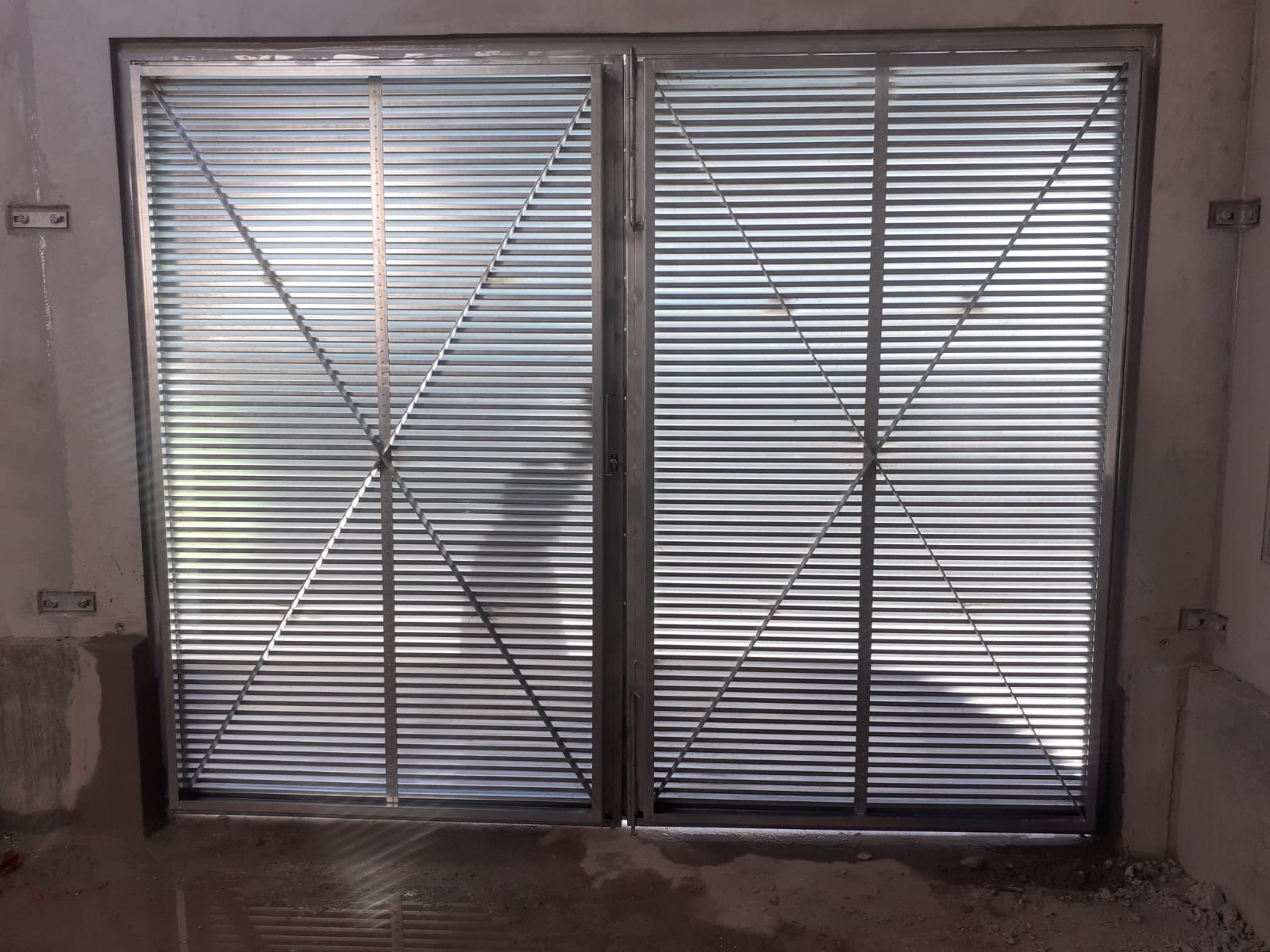 • 1 puerta de doble hoja galvanizada de 250 cm de altura x 310 cm de anchura con lamas de dos hojas en Z y cerradura en triángulo.